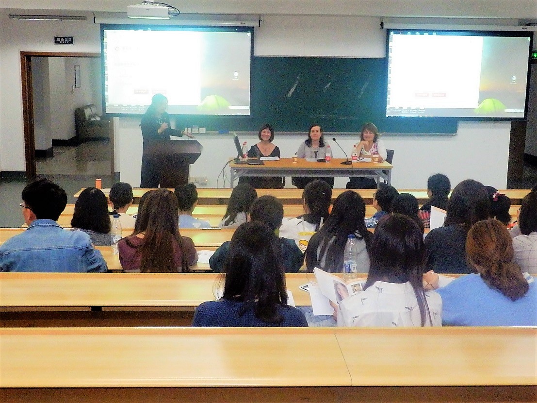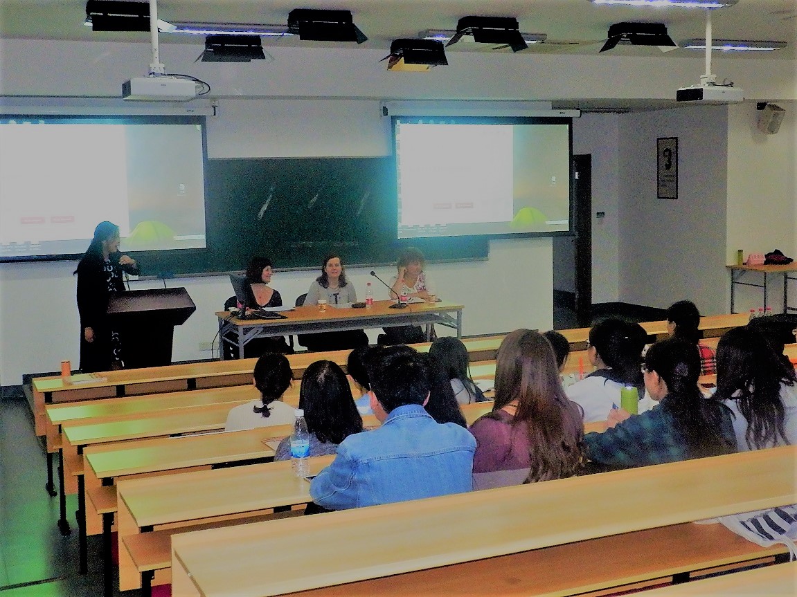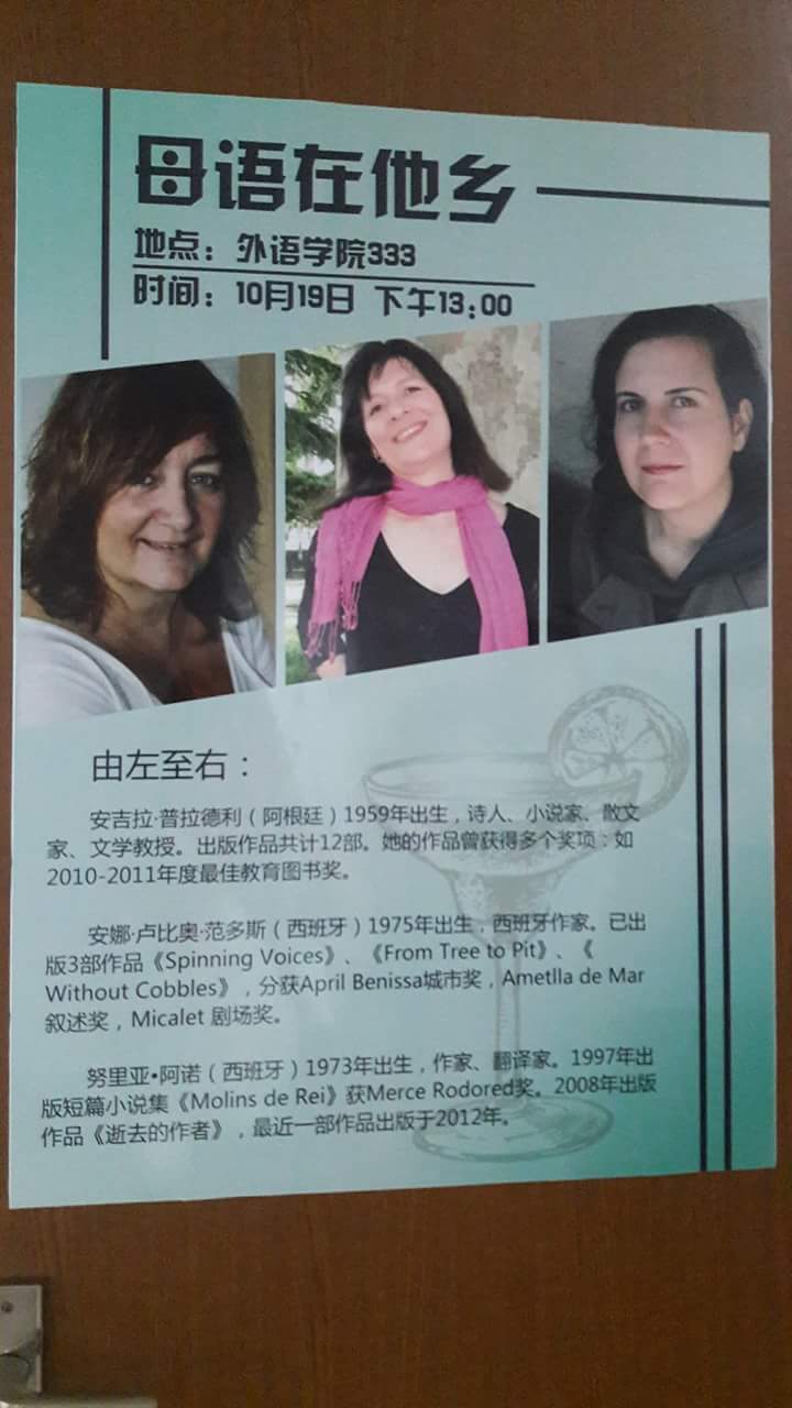 El Departamento de Español de la facultad organizó este acto literario que contó con la presencia de estudiantes chinos que estudian Filología Hispánica. Siwen Ning, profesora de español en esta universidad, presentó el evento ante los alumnos asistentes y luego Anna Rubio, Ángela Pradelli y yo misma hicimos una lectura sobre La lengua nativa en países extranjeros.